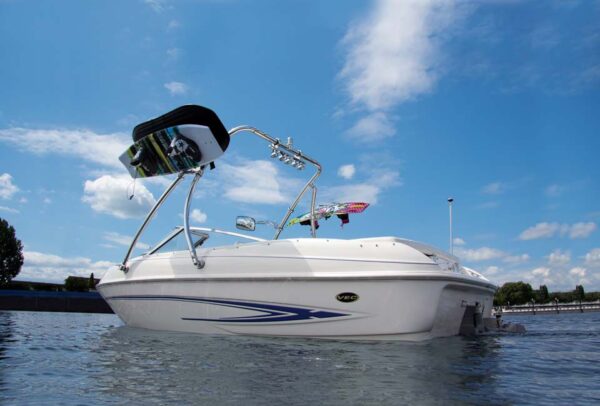 La Jobe Addict Tower 1.1 se fabrica con tubos de aluminio de aviación de 2 diámetros y se puede plegar completamente. La torre tiene bloques de montaje brillantes y pulidos (conexión con el barco) y son fáciles de instalar en cubiertas de barcos de 71 pulgadas / 180 cm a 100 pulgadas / 254 cm de ancho. El Addict se ve muy elegante en cualquier barco y es difícil de igualar en precio y rendimiento.