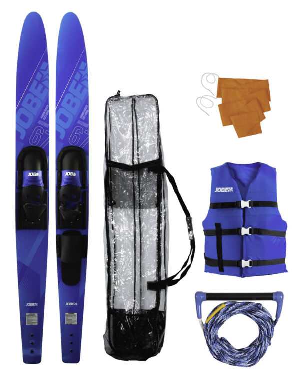 - El paquete contiene: Esquís acuáticos, Bolsa transparente, Ski Combo Transfer, Chaleco Universal Azul and Bandera de deportes acuáticos naranja